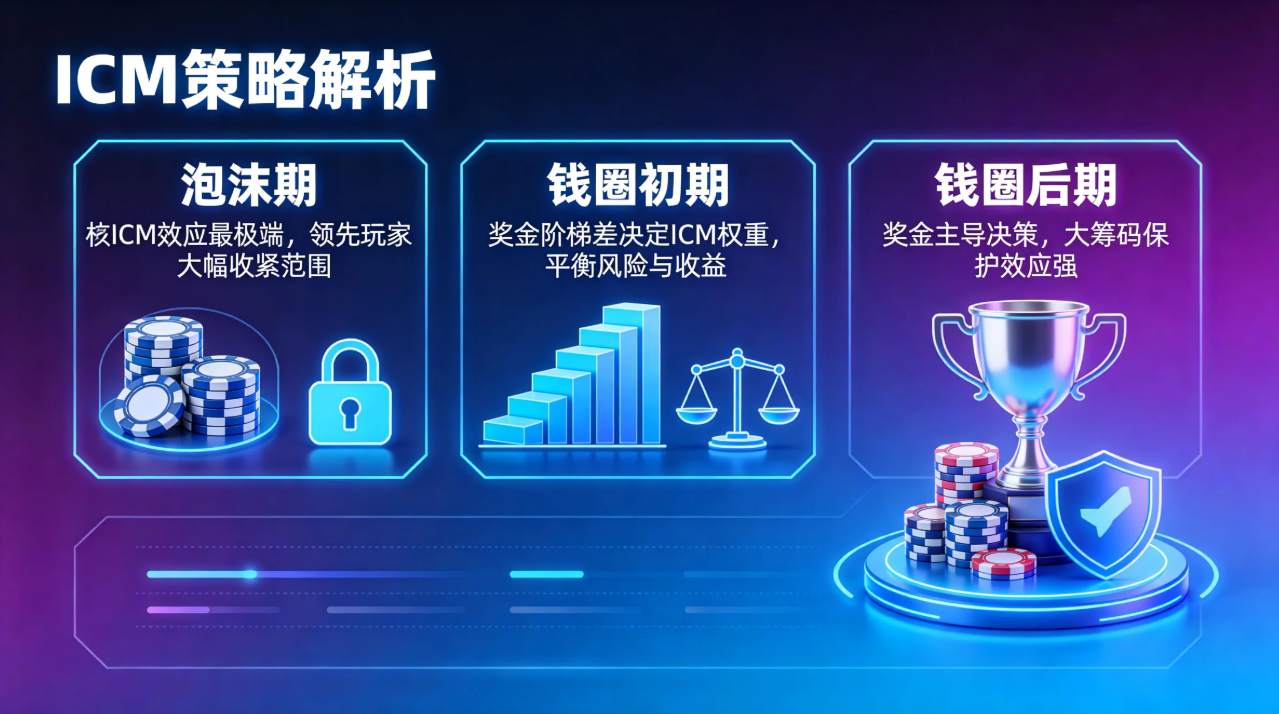 ICM(独立筹码模型)是德州扑克锦标赛的核心决策依据,核心是将筹码量转化为赛事奖金的实际价值,而非单纯看筹码数,直接改变了锦标赛不同阶段的下注、跟注、弃牌策略逻辑。