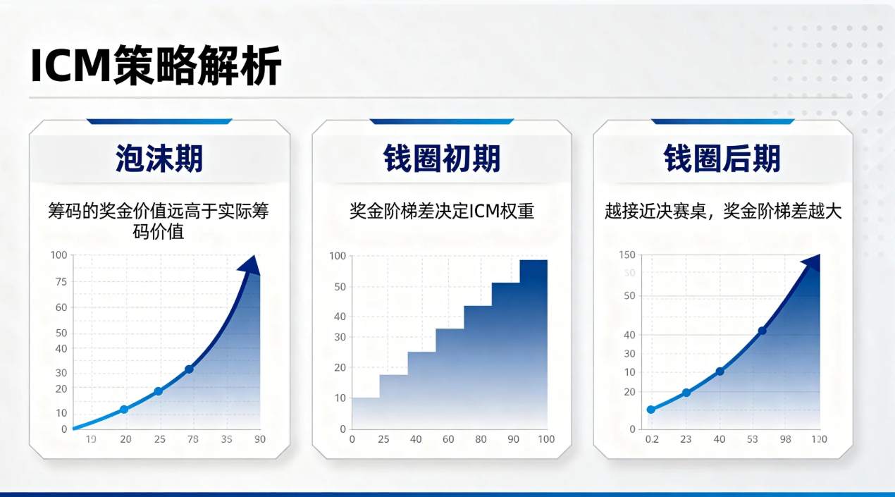 ICM让锦标赛决策脱离了“筹码越多越好”的现金桌思维,转为**“奖金收益最大化”**的思维——任何决策都需先计算筹码的ICM价值,再结合手牌胜率、对手范围判断,而非单纯凭手牌强弱或筹码量下注。